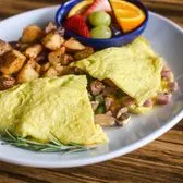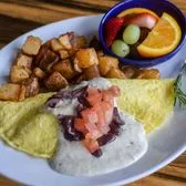 Three egg omelet stuffed with shredded chicken, cheddar jack cheese & topped with our homemade verde sauce.