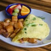Three egg white omelet stuffed with feta, spinach & avocado topped with basil pesto. Served with choice of two breakfast sides.