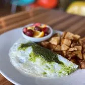 Avocado, cheddar-jack cheese, tomato, Kalamata olives, green chile-sour cream sauce.