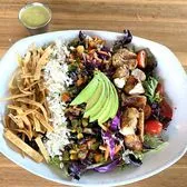 Spring mix, grilled all natural chicken breast, black beans, corn, pico, tomato, sliced avocado, shredded cabbage & carrots, queso fresco & crispy corn tortilla strips. Cilantro Lime Vinaigrette