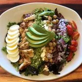 Spring mix, grilled all-natural chicken breast, avocado, tomato, garbanzo beans, Kalamata olives, tabbouleh, red onion, hard-boiled egg, feta cheese.