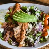 Spring Mix, grilled all-natural chicken breast, avocado, bacon, blue cheese crumbles, red onion, tomato, hard-boiled egg.