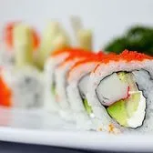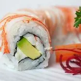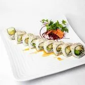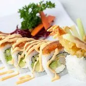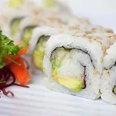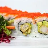 Tempura shrimp, kanikama, cream chesse, eel sauce, and topped with avocado and sesame seeds.