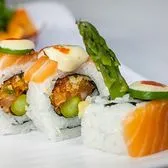 Spicy salmon, tempura crunch, asparagus, fresh salmon, fresh tuna, jalapeño slices, tornado sauce and sriracha on top.