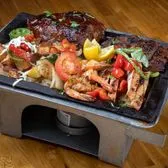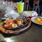 Beef, chicken, shrimp, ribs, calabacitas, Mexican potatoes and peppers.