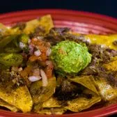 Crispy house made tortilla chips topped with refried beans, chili con queso, cheddar cheese, taco beef, guacamole, sour cream and jalapenos.