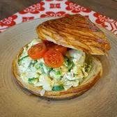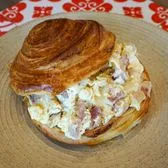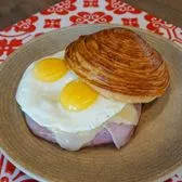 Served on our Spiral Croissant and a side of black beans. Ham, Swiss Cheese and 2 Sunny Side Up Eggs.