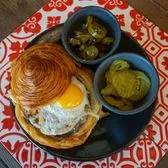 8 .oz Blend Special Choice, Round Croissant, Sunny Side Up, Caramelized Onions, Swiss Cheese, Chipotle Mustard, Pickles and Jalapeños on the Side.