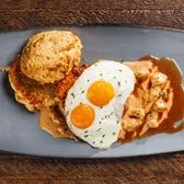 Buttermilk-fried chicken, sunny-side up eggs, buttermilk biscuit, cajun gravy + chicken sausage, hot honey drizzle