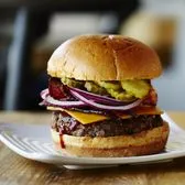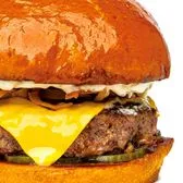 Our custom Beef Blend Patty topped with Cheddar Cheese, Applewood Smoked Bacon, Pickles, Red Onion, and Chipotle BBQ Sauce on a toasted Brioche Bun.