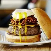 Our custom Beef Blend Patty topped with American Cheese, Applewood Smoked Bacon, Ham, Hashbrowns, Fried Egg, and Ketchup on a toasted Brioche Bun.