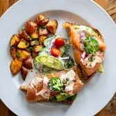 Freshly baked Italian rustic bread, chipotle cream cheese, cucumbers, guacamole spread, capers, red onions, dijon drizzle, served with rosemary fingerling potatoes, cucumber dill salad*
