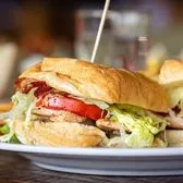 Served with Fries. Oven roasted shredded chicken, homemade potato crisps, provolone, lettuce, tomato, mayo, pickles, honey habanero aioli.