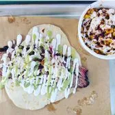 Brisket served on a homemade beef tallow tortilla topped with your choice of sauce.