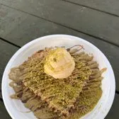 Milk chocolate drizzle topped off with Kunafa, pistachio sauce and a scoop of vanilla ice cream for the perfect balance.