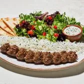 Seasoned minced beef kabob made with all-natural ground beef and seasonings (280 Cals). Plates are served with warm pita bread (110 Cals), choice of sauce (30-130 Cals), and two sides (240-720 Cals).
