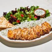 Succulent pieces of boneless chicken tenders grilled over an open flame (170 Cals). Plates are served with warm pita bread (110 Cals), choice of sauce (30-130 Cals), and two sides (240-720 Cals).