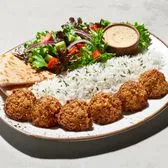 Six rounds of handcrafted falafel (410 Cals). Plates are served with warm pita bread (110 Cals), choice of sauce (30-130 Cals), and two sides (240-720 Cals).