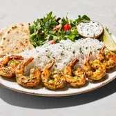 Juicy, flame-grilled garlic shrimp finished with a fresh lemon and parsley drizzle (210 Cals). Plates are served with warm pita bread (110 Cals), choice of sauce (30-130 Cals), and two sides (240-720 Cals).