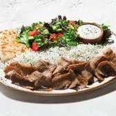 Succulent pieces of boneless chicken tenders (170 Cals) and our shaved gyro meat (550 Cals). Plates are served with warm pita bread (110 Cals), choice of sauce (30-130 Cals), and two sides (240-720 Cals). Gyro Meat is a blend of beef, lamb and traditional Near Eastern spices.