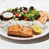Sustainably raised salmon filet simply seasoned and grilled (350 Cals). Plates are served with warm pita bread (110 Cals), choice of sauce (30-130 Cals), and two sides (240-720 Cals).