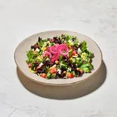 Lettuce medley, feta cheese, Greek olives, sliced pepperoncini, tomato, cucumber, house pickled red onions, crunchy chickpeas, house vinaigrette. 180 cals.