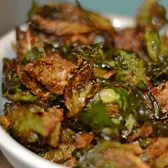 Vegetarian. Spicy. No fish sauce. (Sweet, sour, spicy) roasted brussel sprouts & crispy Thai basil wok-tossed in Mam's homemade special sweet & tangy roasted chili reduction.