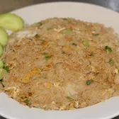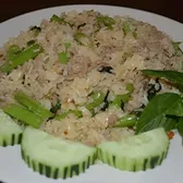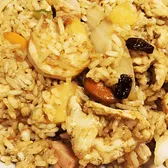 Vegetarian. No fish sauce. Stir-fried rice with pineapple, shrimp, chicken, ham, Thai sausage, cashew nuts, raisins, onions, bell peppers, mixed curry powder and soy sauce. No meat option (can sub. With green bean or bok choy or Chinese broccoli).