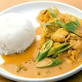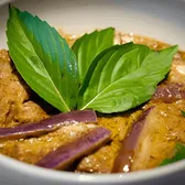 Spicy. Stir-fried choice of meat in red curry paste, coconut milk reduction, serrano peppers, Thai basil, peppercorn & Kaffir lime leaves.