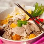 Rice stick noodle or egg noodle with pork, fish ball mixed with special soy sauce, lime, sugar, ground peanuts, bean sprouts, cilantro, ground pepper. Served with roasted chili on the side.