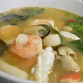 Spicy. Hot and spicy lime basil soup with tilapia fillet shrimp, squid, mussels, scallops, Thai chili, Thai basil, galangal, straw mushrooms, shallots, lemongrass and Kaffir lime leaves with roasted chili pepper and cilantro.