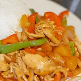 Stir-fried choice of meat with lighter honey sweet and sour sauce, bell peppers, yellow onions and pineapple.