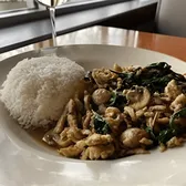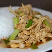 Gluten Free. Spicy. Stir-fried choice of meat with Thai chili paste, Thai chili, brown sugar, green onions, yellow onions & cashew nuts.