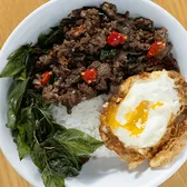 Spicy. Stir-fried meat, Thai pepper, basil and special mixed sauce in a hot clay pot. Topped with Thai style crispy and oozy egg.