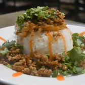 Spicy. A crispy & oozy wok- fried egg resting on a bed of rice, topped with a choice of meat that's stir fried with red chili, garlic soy sauce & garnished with cilantro & imported sriracha chili sauce.