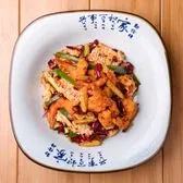 12 pcs. Battered and deep-fried jumbo shrimps heavily seasoned with ginger, garlic, dry red chilies, Sichuan peppercorns, hotpot sauce, fermented black bean, aged hot pot oil, along with potato, cauliflower, celery, lotus roots, and king oyster mushroom