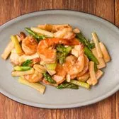 12 pcs. Jumbo shrimps slowly simmered in brown sauce with king oyster mushrooms, asparagus, onions, and gingers