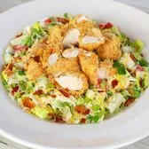 Romaine lettuce, tomatoes, smoked bacon, shredded cheese, cabbage and green onions tossed in our house made Ranch dressing and topped with our signature hand-breaded chicken tenders