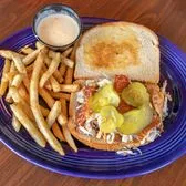Tender pulled pork, bacon, pickles and pickled cabbage, topped with queso blanco, served on toasted sourdough bread.