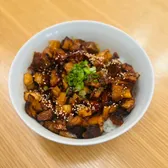 Pork chashu diced on rice with original sauce, green onions and sesame seeds