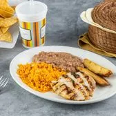 Choice of one Taco and served with Taco Condiments, Mexican Rice, Refried Beans and Kids Drink Picadillo Beef, choice of Crispy, Corn or Flour Tortilla Shredded Chicken, choice of Crispy, Corn or Flour Tortilla