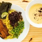 Included Toppings: Choice of chashu, roasted nori, lime wedge, kikurage mushrooms and green onions with ground pork, fresh garlic, fried onions, and mayu garlic oil Broth: Tonkotsu Bonito (Can not be substituted)