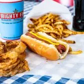 Our Griddle Dog served with chili, cheddar cheese, mustard, and diced onions.