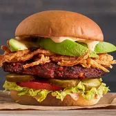 Black Bean Vegan, Fresh Avocado, Fried Onion Strings, Pickles, Lettuce, Tomato, MOOYAH Sauce, Signature Potato Bun