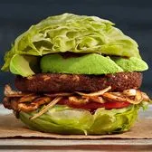 Black Bean Vegan Iceburger, Fresh Avocado, Sautéed Mushrooms, Grilled Onions, Lettuce, Tomato, BBQ Sauce