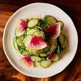 Cucumber, vinegar, rice crackers, watermelon radish with crab.