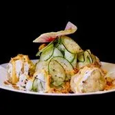 Cucumber, basil, shredded crab, dressing, shichimi, carrots, rice crackers.