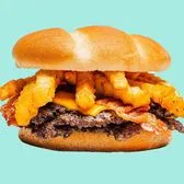 Two smashed crispy beef patties with house seasoning, American cheese, bacon, topped with crinkle fries on a toasted bun.