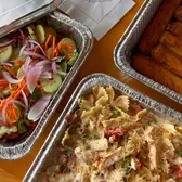 All-natural, wood-fired grilled chicken, sun-dried tomatoes, prosciutto, peas, and red onions, sauteed in alfredo sauce. Served with choice of House salad or Caesar salad to fit portion. Along with breadsticks.