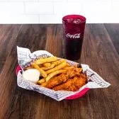 2 Giant Chicken Tenders tossed in a Buffalo Sauce of your choice. Served alongside a side of Jersey Shore Fries and a drink.